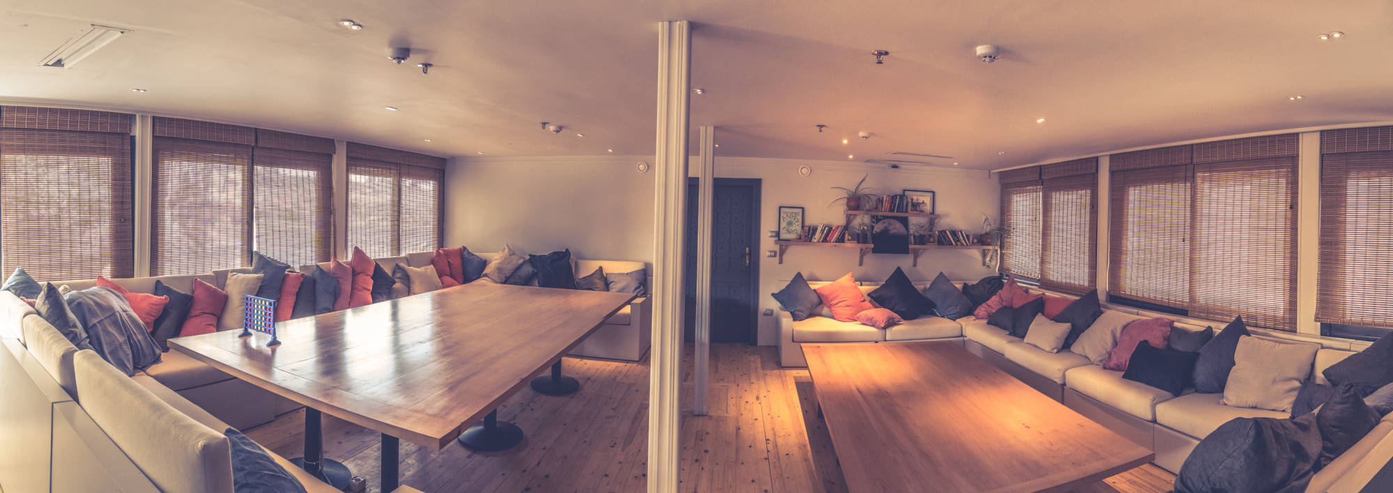 Upper deck meeting room with a 360-degree panoramic view. Several spaces for relaxation, workshops, yoga, or meditation, and a library.